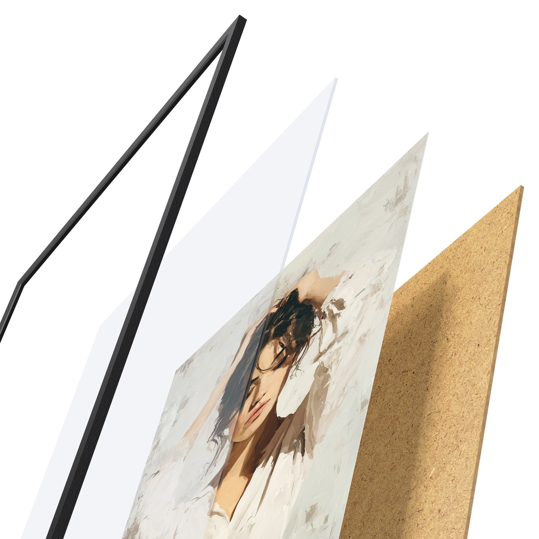 Plagát sa skladá z rámu, plexiskla, vytlačeného obrazu a podkladu z drevotriesky. Plagát možno okamžite zavesiť na stenu vďaka úchytom na zadnej strane.