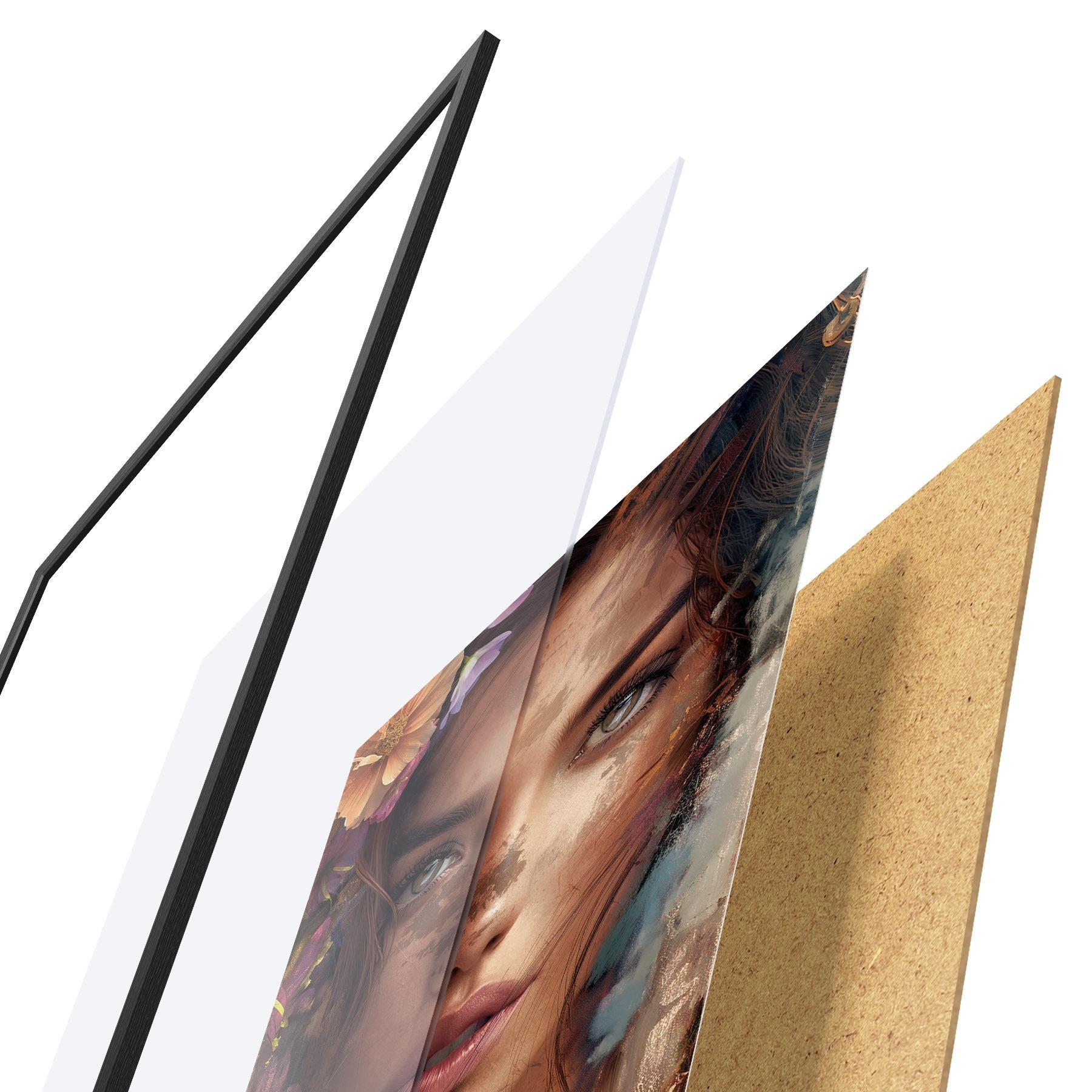 Plagát sa skladá z rámu, plexiskla, vytlačeného obrazu a podkladu z drevotriesky. Plagát možno okamžite zavesiť na stenu vďaka úchytom na zadnej strane.