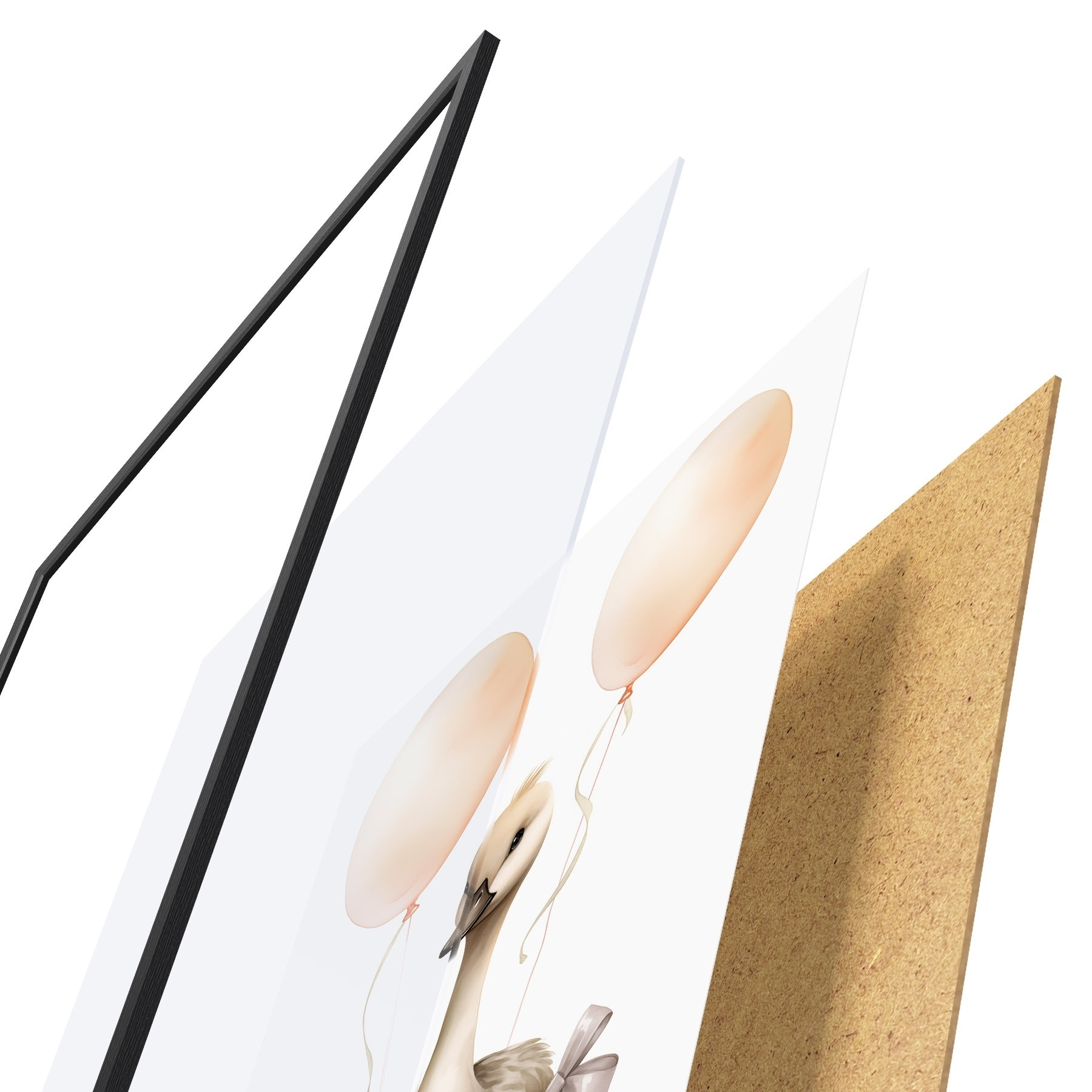 Plagát sa skladá z rámu, plexiskla, vytlačeného obrazu a podkladu z drevotriesky. Plagát možno okamžite zavesiť na stenu vďaka úchytom na zadnej strane.