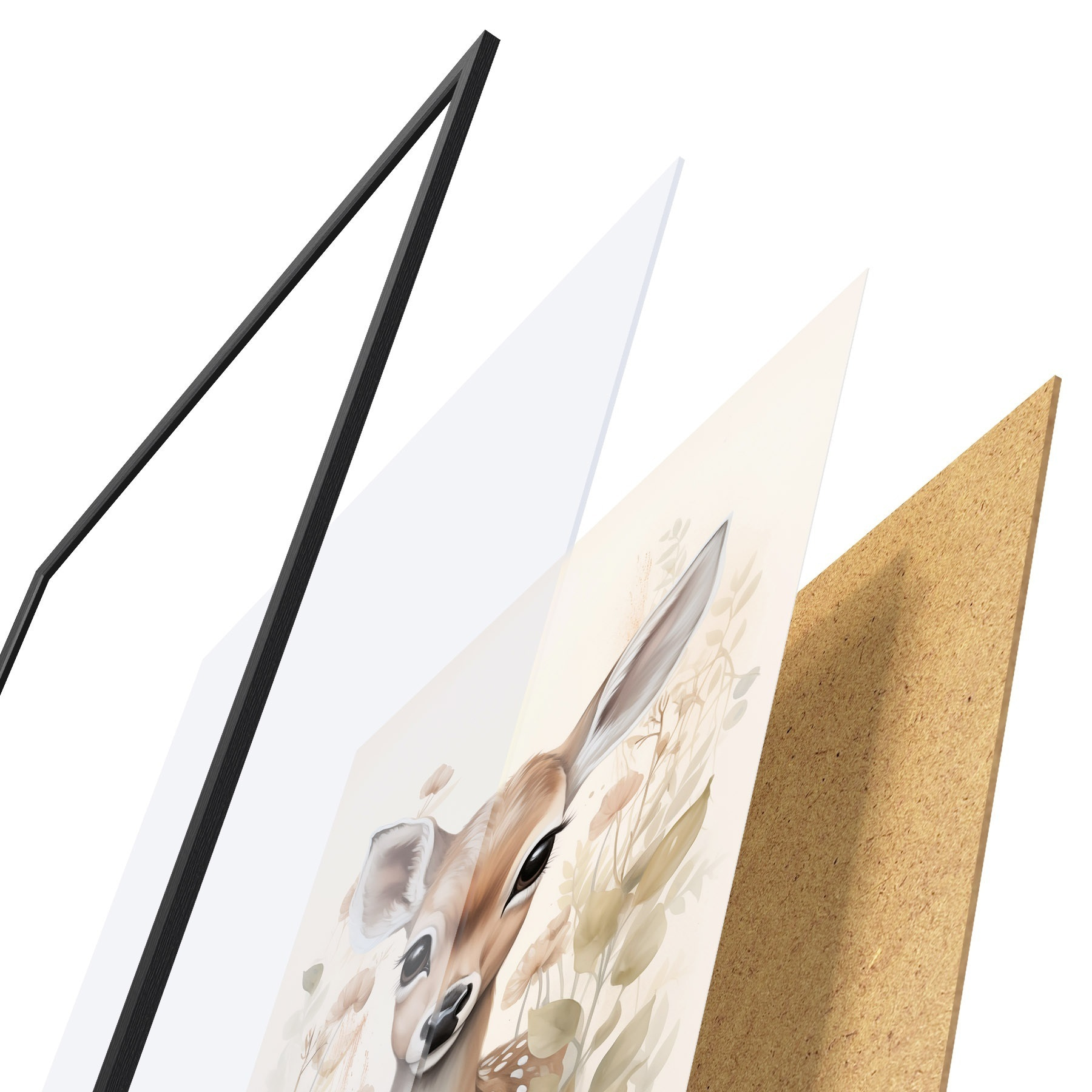 Plagát sa skladá z rámu, plexiskla, vytlačeného obrazu a podkladu z drevotriesky. Plagát možno okamžite zavesiť na stenu vďaka úchytom na zadnej strane.
