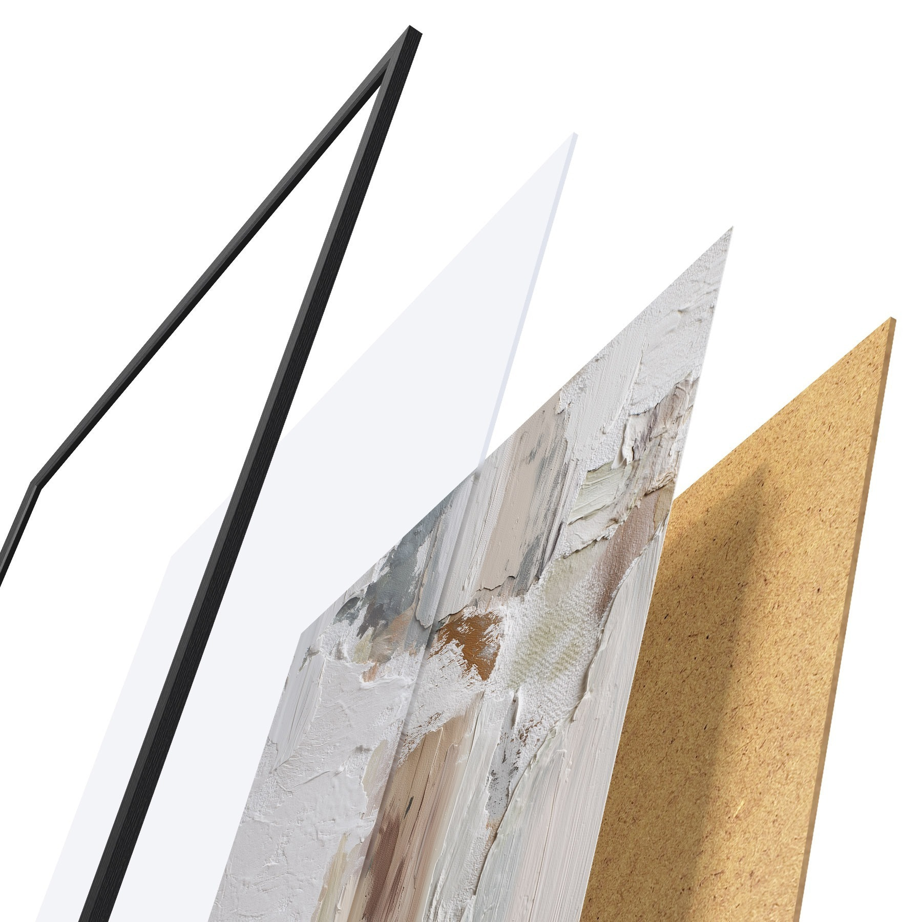 Plagát sa skladá z rámu, plexiskla, vytlačeného obrazu a podkladu z drevotriesky. Plagát možno okamžite zavesiť na stenu vďaka úchytom na zadnej strane.