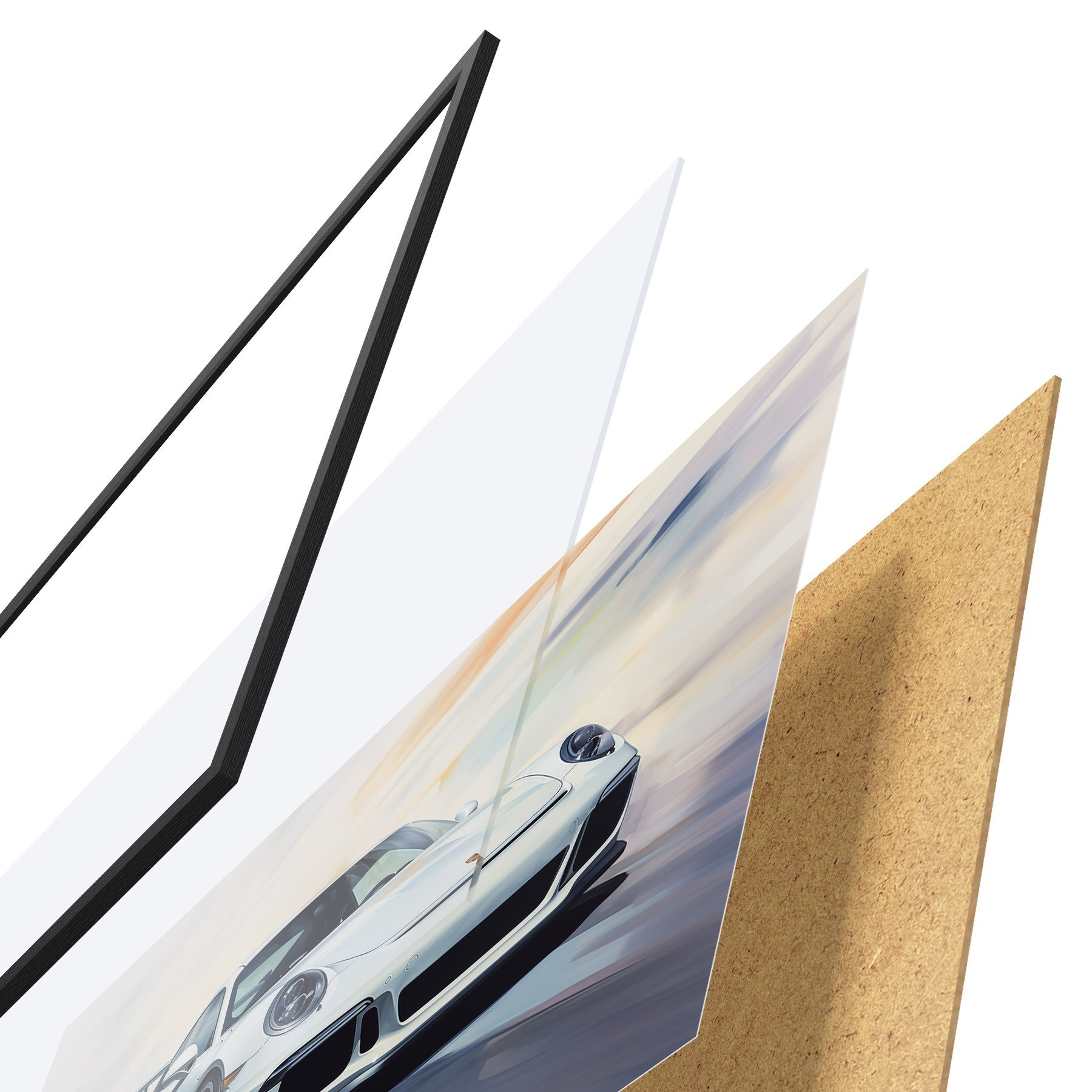 Plagát sa skladá z rámu, plexiskla, vytlačeného obrazu a podkladu z drevotriesky. Plagát možno okamžite zavesiť na stenu vďaka úchytom na zadnej strane.