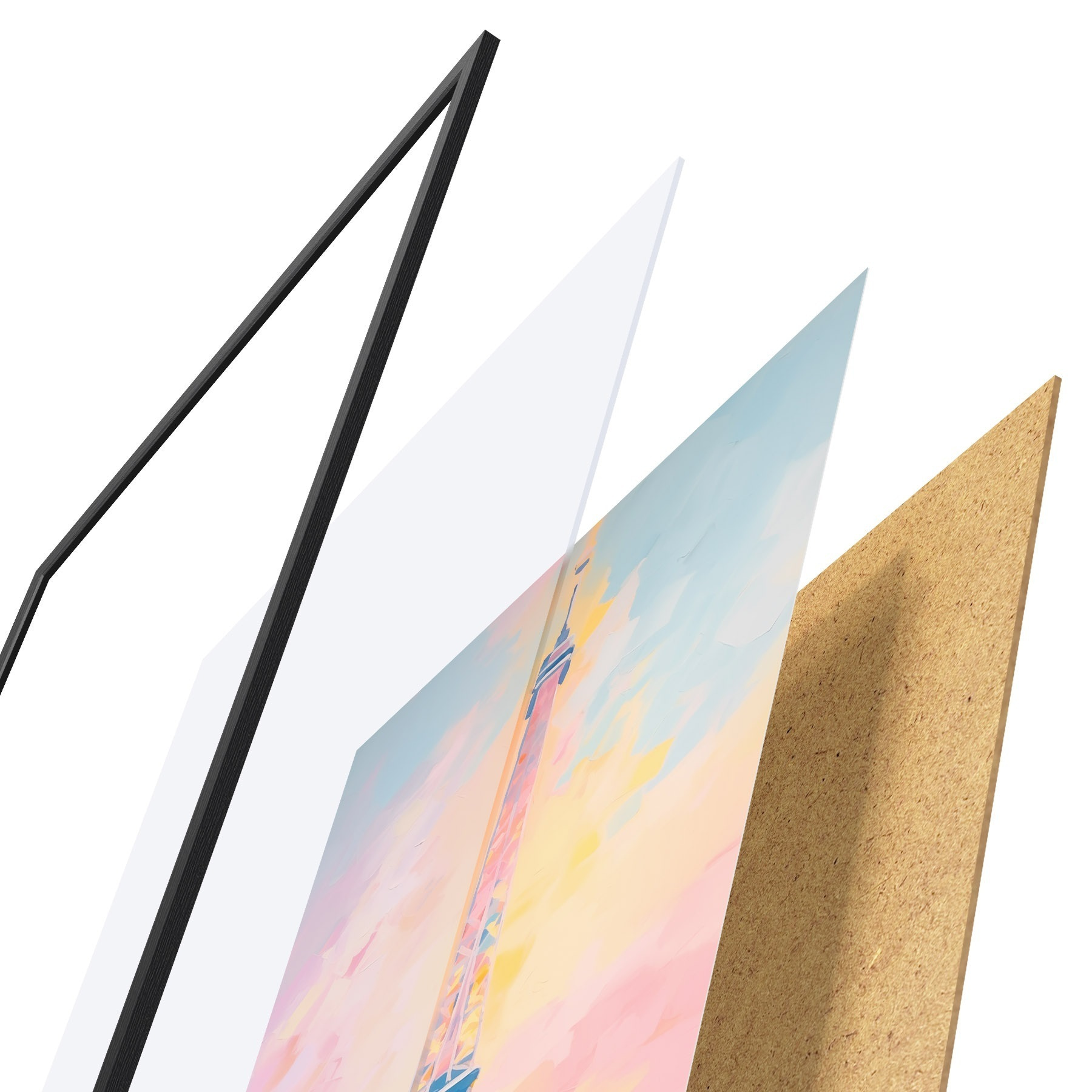 Plagát sa skladá z rámu, plexiskla, vytlačeného obrazu a podkladu z drevotriesky. Plagát možno okamžite zavesiť na stenu vďaka úchytom na zadnej strane.