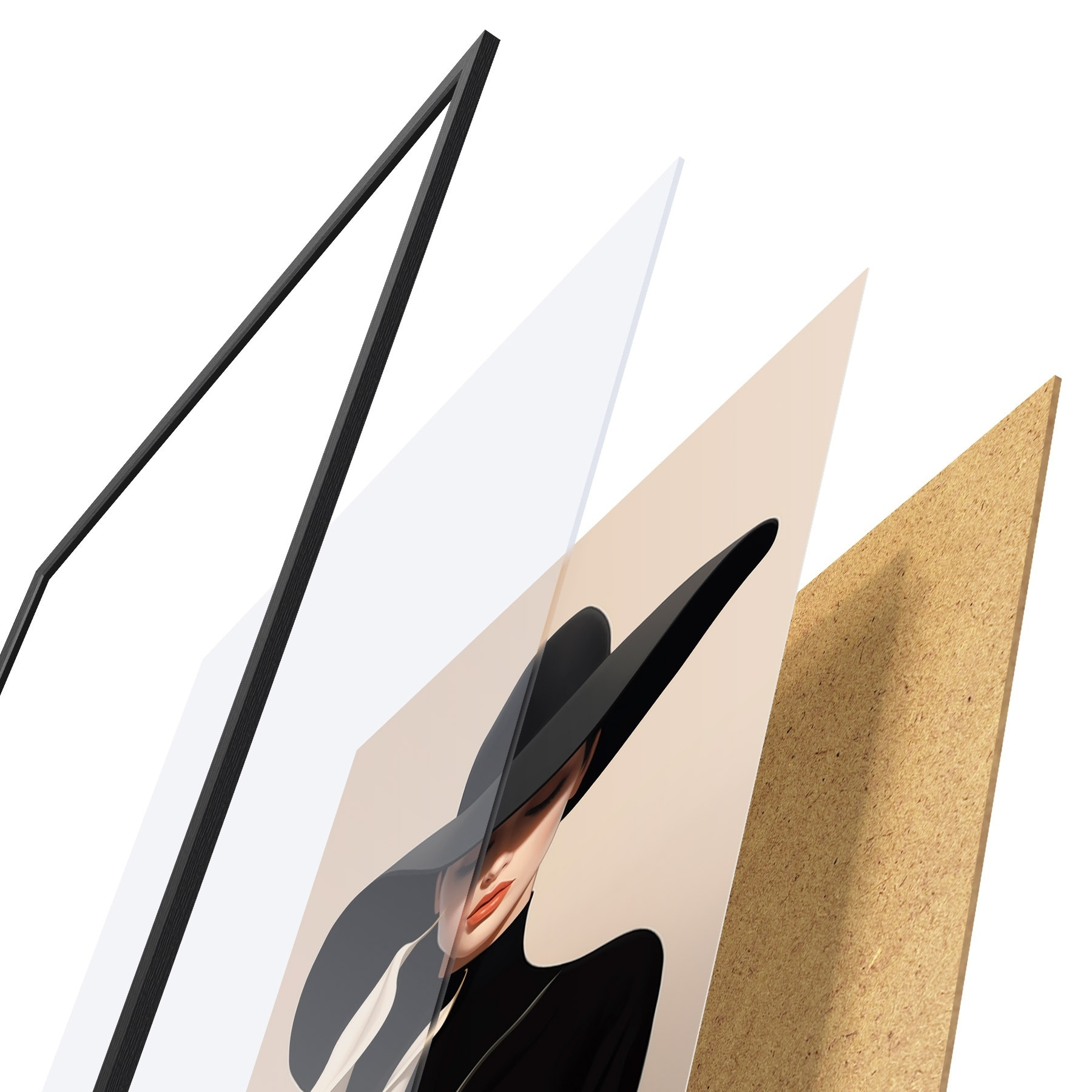Plagát sa skladá z rámu, plexiskla, vytlačeného obrazu a podkladu z drevotriesky. Plagát možno okamžite zavesiť na stenu vďaka úchytom na zadnej strane.