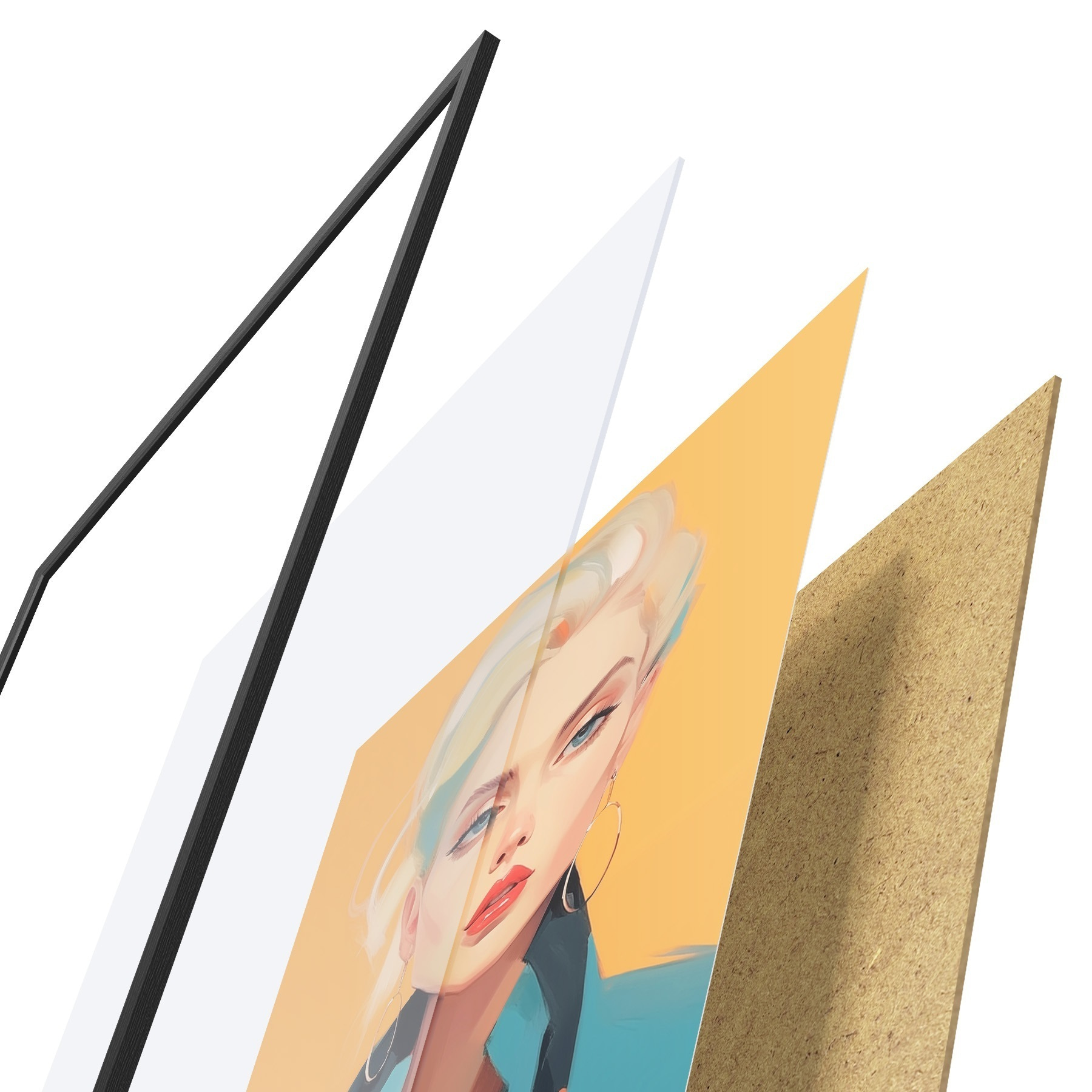 Plagát sa skladá z rámu, plexiskla, vytlačeného obrazu a podkladu z drevotriesky. Plagát možno okamžite zavesiť na stenu vďaka úchytom na zadnej strane.