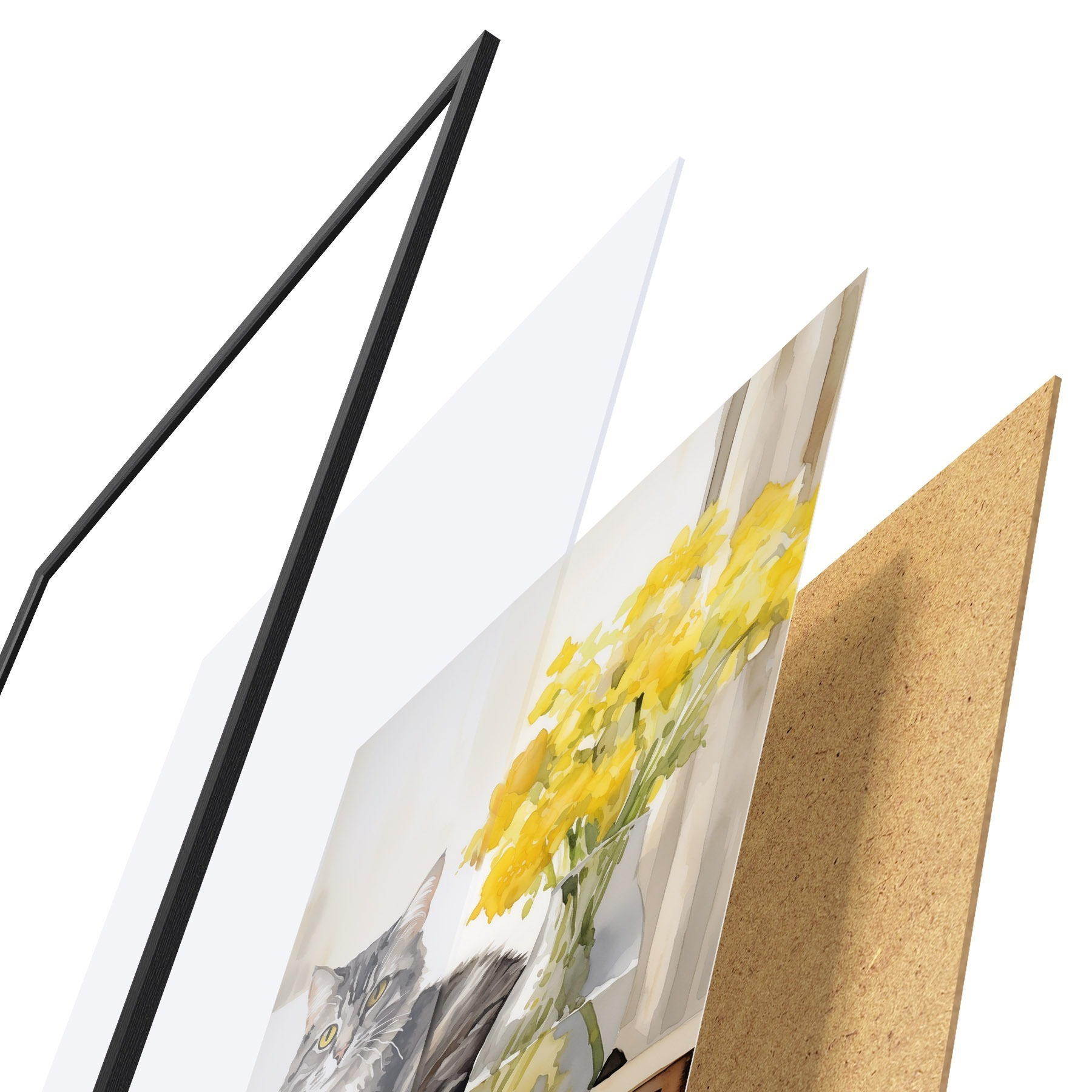 Plagát sa skladá z rámu, plexiskla, vytlačeného obrazu a podkladu z drevotriesky. Plagát možno okamžite zavesiť na stenu vďaka úchytom na zadnej strane.