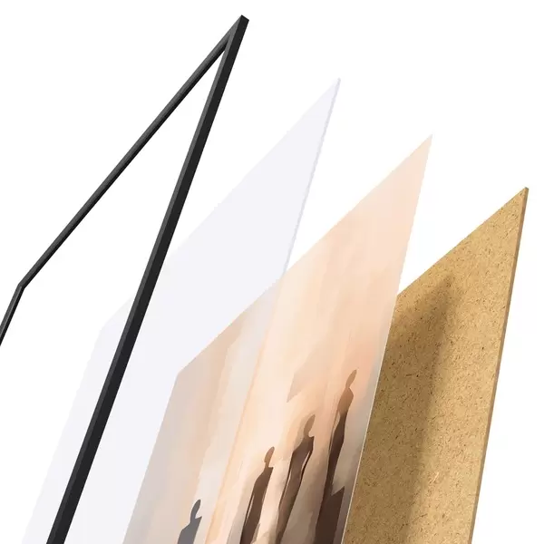 Plagát sa skladá z rámu, plexiskla, vytlačeného obrazu a podkladu z drevotriesky. Plagát možno okamžite zavesiť na stenu vďaka úchytom na zadnej strane.