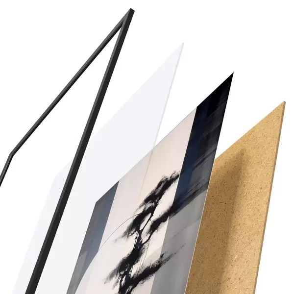 Plagát sa skladá z rámu, plexiskla, vytlačeného obrazu a podkladu z drevotriesky. Plagát možno okamžite zavesiť na stenu vďaka úchytom na zadnej strane.