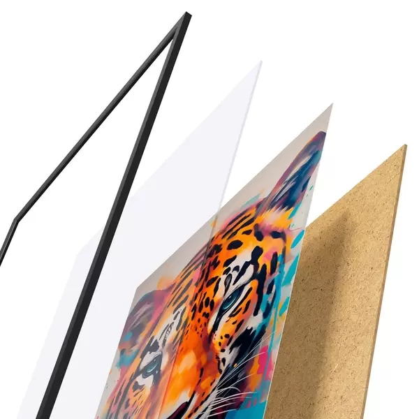 Plagát sa skladá z rámu, plexiskla, vytlačeného obrazu a podkladu z drevotriesky. Plagát možno okamžite zavesiť na stenu vďaka úchytom na zadnej strane.