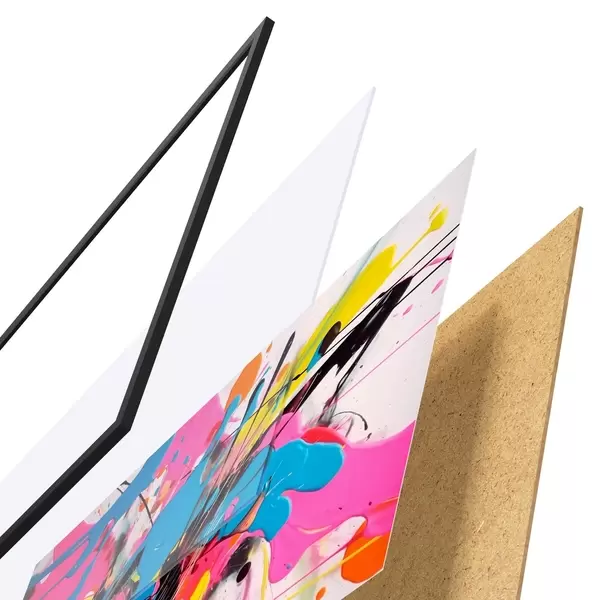 Plagát sa skladá z rámu, plexiskla, vytlačeného obrazu a podkladu z drevotriesky. Plagát možno okamžite zavesiť na stenu vďaka úchytom na zadnej strane.