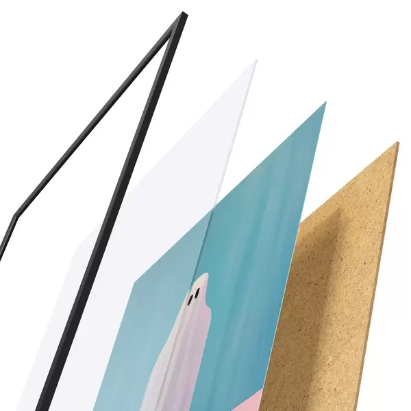 Plagát sa skladá z rámu, plexiskla, vytlačeného obrazu a podkladu z drevotriesky. Plagát možno okamžite zavesiť na stenu vďaka úchytom na zadnej strane.