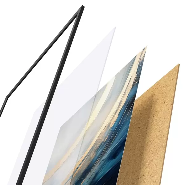 Plagát sa skladá z rámu, plexiskla, vytlačeného obrazu a podkladu z drevotriesky. Plagát možno okamžite zavesiť na stenu vďaka úchytom na zadnej strane.
