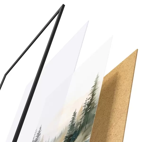 Plagát sa skladá z rámu, plexiskla, vytlačeného obrazu a podkladu z drevotriesky. Plagát možno okamžite zavesiť na stenu vďaka úchytom na zadnej strane.
