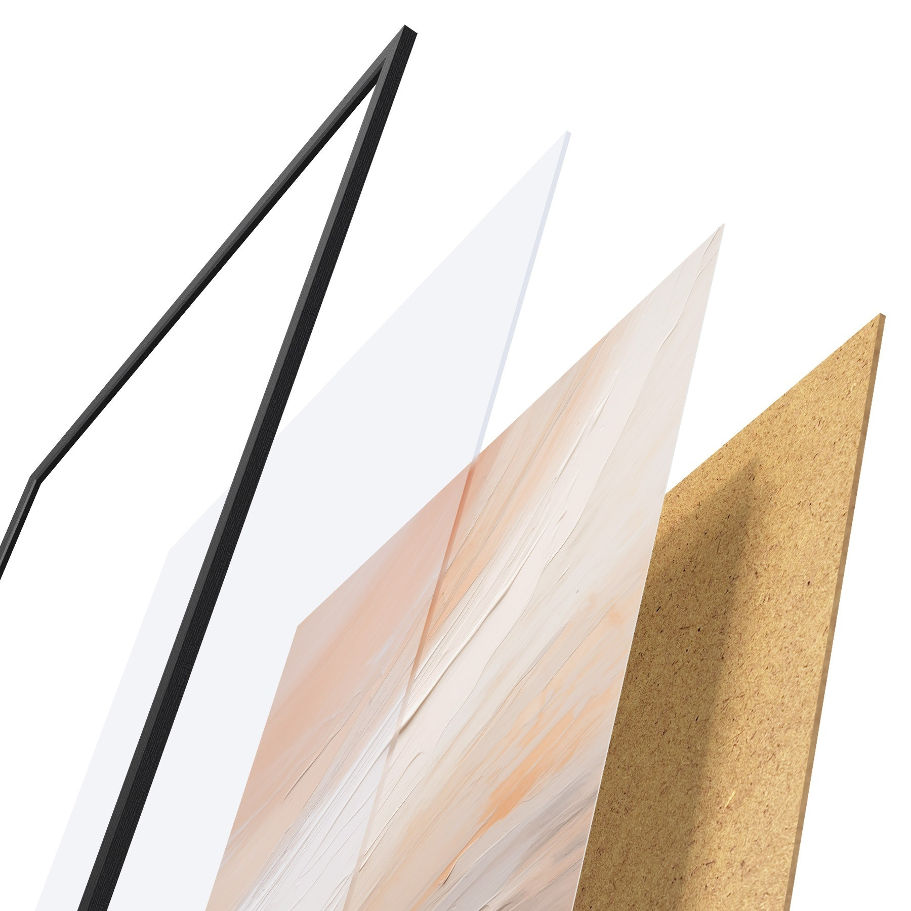 Plagát sa skladá z rámu, plexiskla, vytlačeného obrazu a podkladu z drevotriesky. Plagát možno okamžite zavesiť na stenu vďaka úchytom na zadnej strane.