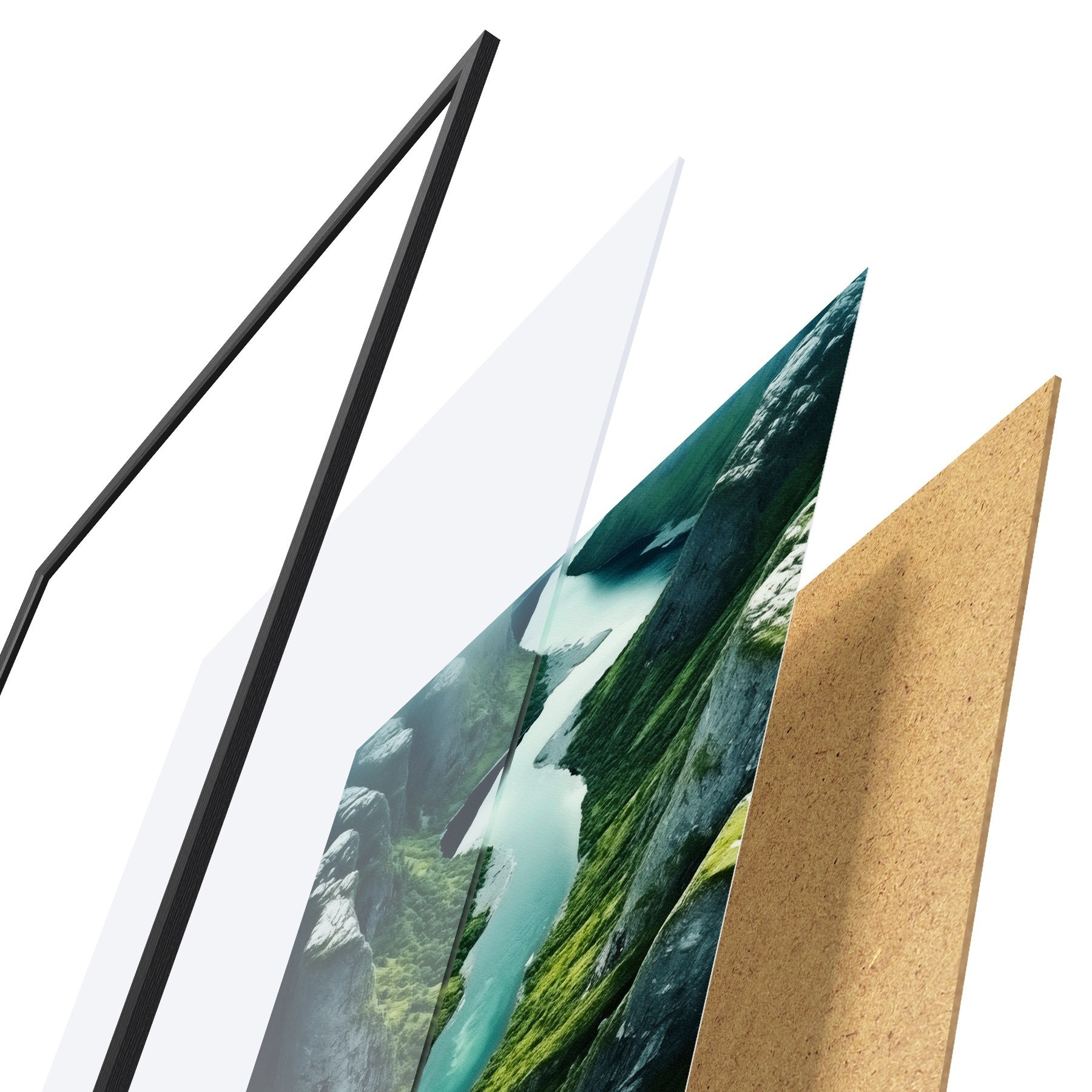 Plagát sa skladá z rámu, plexiskla, vytlačeného obrazu a podkladu z drevotriesky. Plagát možno okamžite zavesiť na stenu vďaka úchytom na zadnej strane.