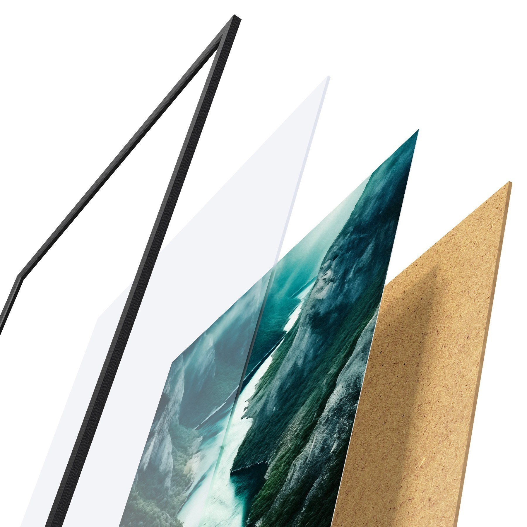 Plagát sa skladá z rámu, plexiskla, vytlačeného obrazu a podkladu z drevotriesky. Plagát možno okamžite zavesiť na stenu vďaka úchytom na zadnej strane.