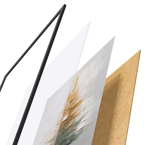 Plagát sa skladá z rámu, plexiskla, vytlačeného obrazu a podkladu z drevotriesky. Plagát možno okamžite zavesiť na stenu vďaka úchytom na zadnej strane.