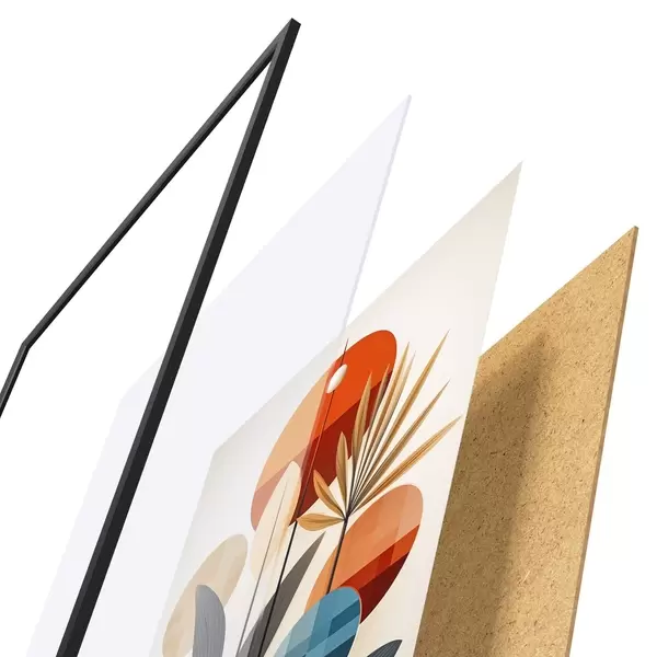 Plagát sa skladá z rámu, plexiskla, vytlačeného obrazu a podkladu z drevotriesky. Plagát možno okamžite zavesiť na stenu vďaka úchytom na zadnej strane.
