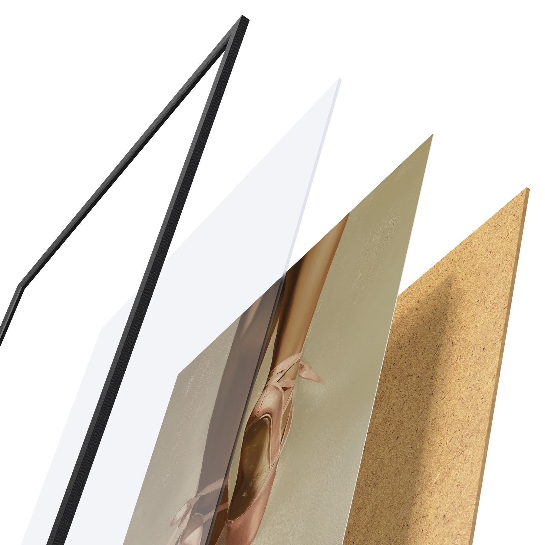 Plagát sa skladá z rámu, plexiskla, vytlačeného obrazu a podkladu z drevotriesky. Plagát možno okamžite zavesiť na stenu vďaka úchytom na zadnej strane.