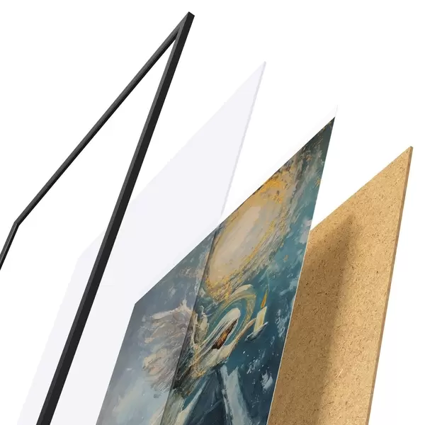 Plagát sa skladá z rámu, plexiskla, vytlačeného obrazu a podkladu z drevotriesky. Plagát možno okamžite zavesiť na stenu vďaka úchytom na zadnej strane.