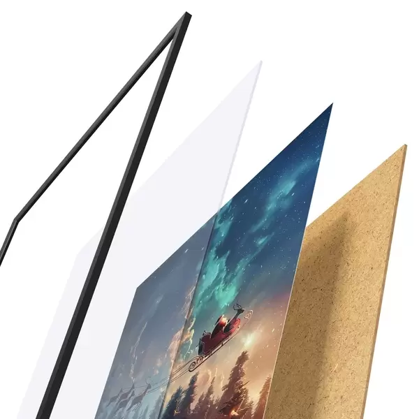 Plagát sa skladá z rámu, plexiskla, vytlačeného obrazu a podkladu z drevotriesky. Plagát možno okamžite zavesiť na stenu vďaka úchytom na zadnej strane.