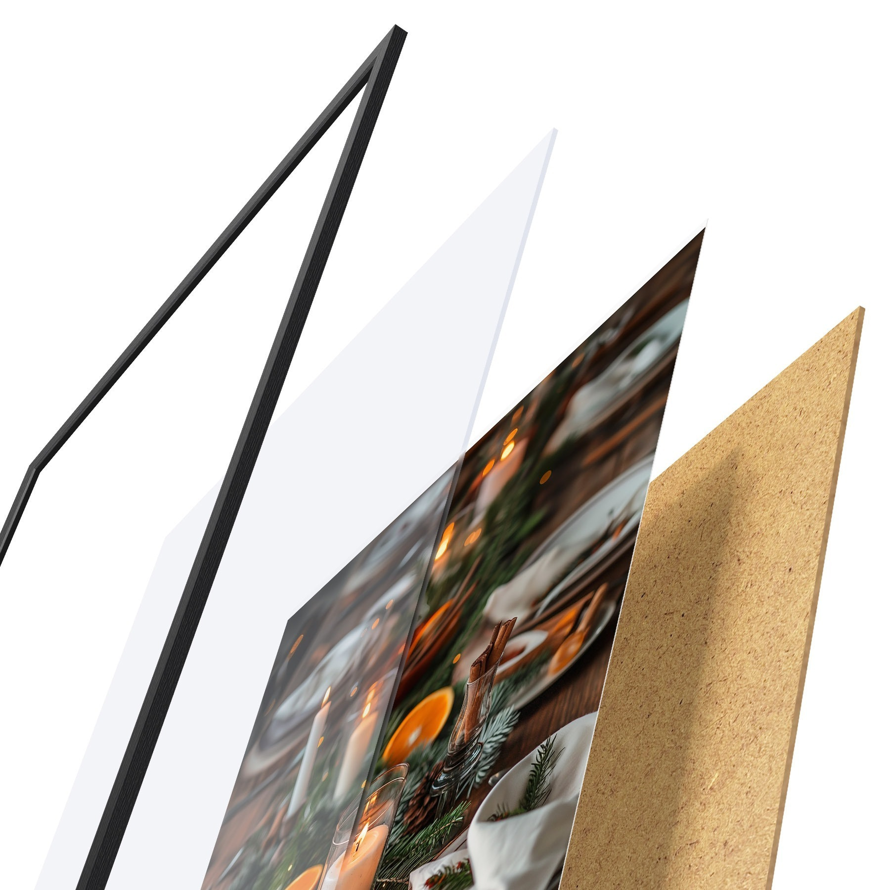 Plagát sa skladá z rámu, plexiskla, vytlačeného obrazu a podkladu z drevotriesky. Plagát možno okamžite zavesiť na stenu vďaka úchytom na zadnej strane.