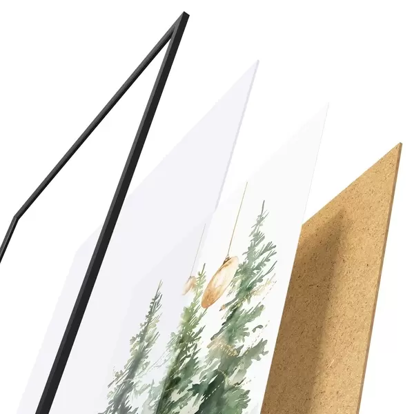 Plagát sa skladá z rámu, plexiskla, vytlačeného obrazu a podkladu z drevotriesky. Plagát možno okamžite zavesiť na stenu vďaka úchytom na zadnej strane.