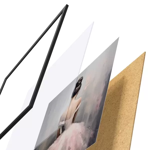 Plagát sa skladá z rámu, plexiskla, vytlačeného obrazu a podkladu z drevotriesky. Plagát možno okamžite zavesiť na stenu vďaka úchytom na zadnej strane.