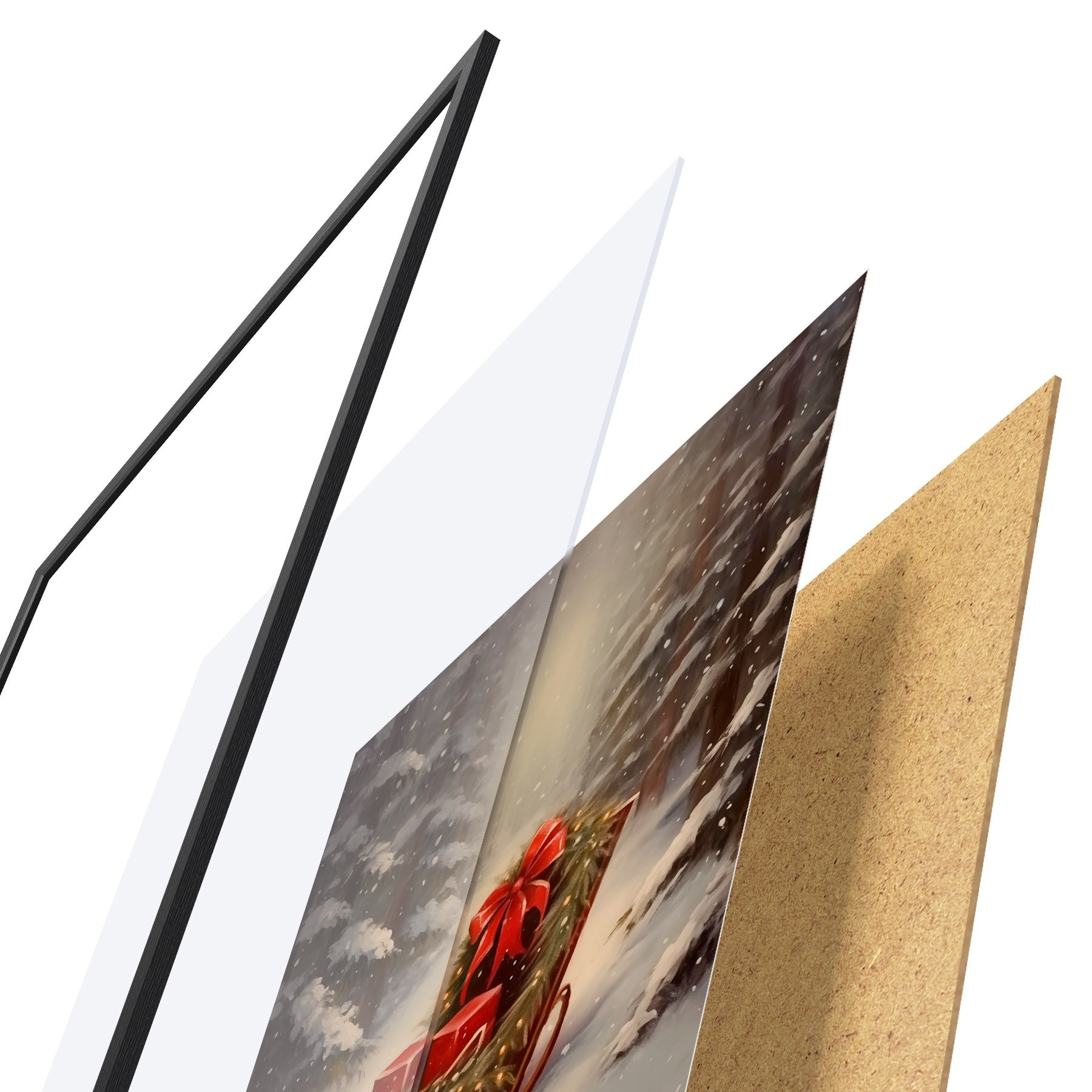 Plagát sa skladá z rámu, plexiskla, vytlačeného obrazu a podkladu z drevotriesky. Plagát možno okamžite zavesiť na stenu vďaka úchytom na zadnej strane.