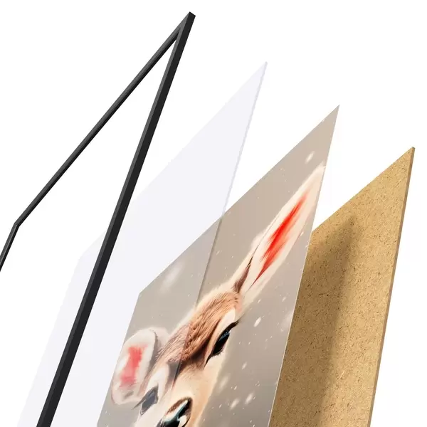 Plagát sa skladá z rámu, plexiskla, vytlačeného obrazu a podkladu z drevotriesky. Plagát možno okamžite zavesiť na stenu vďaka úchytom na zadnej strane.
