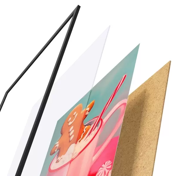 Plagát sa skladá z rámu, plexiskla, vytlačeného obrazu a podkladu z drevotriesky. Plagát možno okamžite zavesiť na stenu vďaka úchytom na zadnej strane.