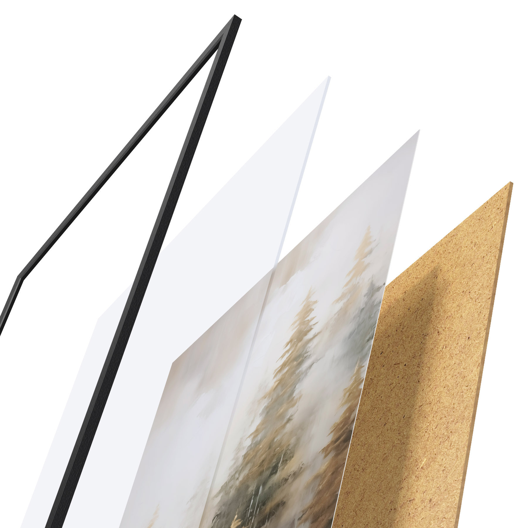 Plagát sa skladá z rámu, plexiskla, vytlačeného obrazu a podkladu z drevotriesky. Plagát možno okamžite zavesiť na stenu vďaka úchytom na zadnej strane.