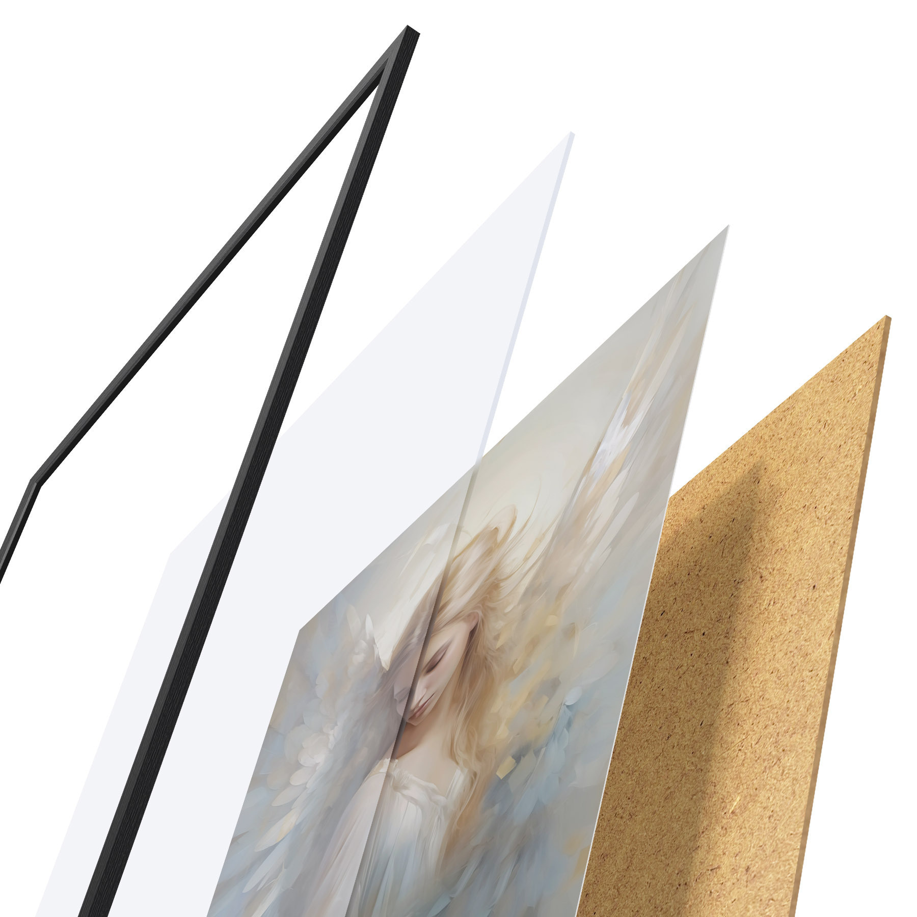 Plagát sa skladá z rámu, plexiskla, vytlačeného obrazu a podkladu z drevotriesky. Plagát možno okamžite zavesiť na stenu vďaka úchytom na zadnej strane.