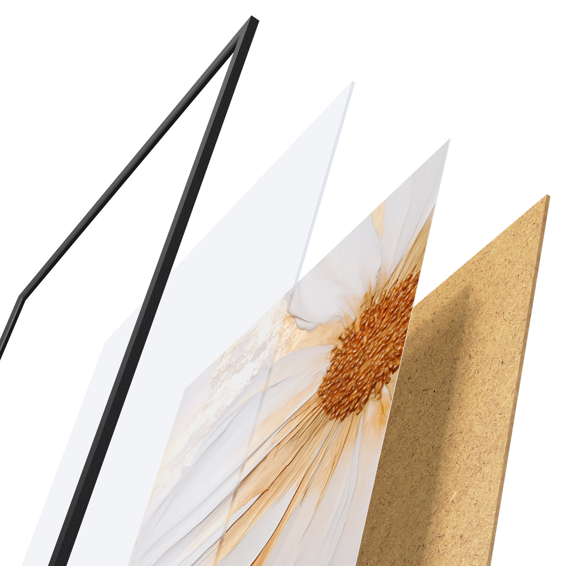 Plagát sa skladá z rámu, plexiskla, vytlačeného obrazu a podkladu z drevotriesky. Plagát možno okamžite zavesiť na stenu vďaka úchytom na zadnej strane.