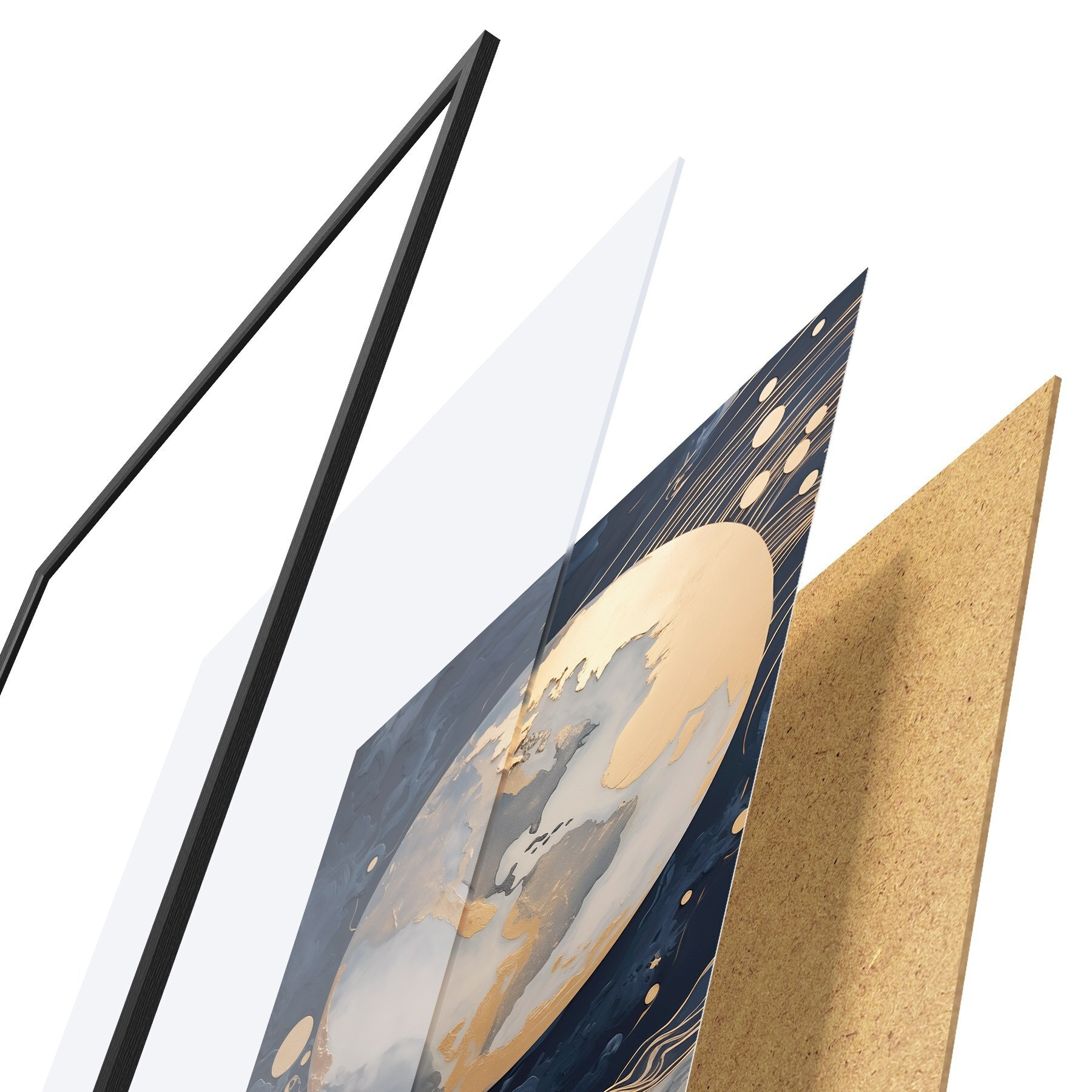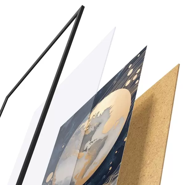 Plagát sa skladá z rámu, plexiskla, vytlačeného obrazu a podkladu z drevotriesky. Plagát možno okamžite zavesiť na stenu vďaka úchytom na zadnej strane.