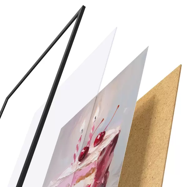 Plagát sa skladá z rámu, plexiskla, vytlačeného obrazu a podkladu z drevotriesky. Plagát možno okamžite zavesiť na stenu vďaka úchytom na zadnej strane.