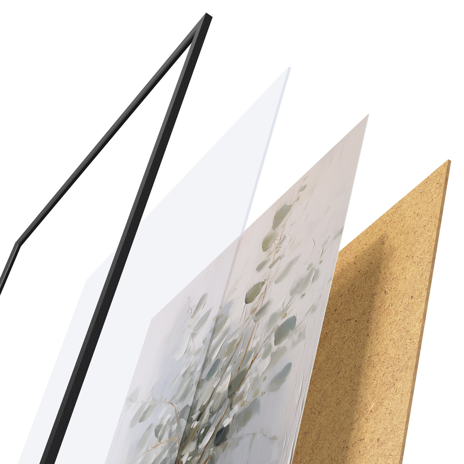 Plagát sa skladá z rámu, plexiskla, vytlačeného obrazu a podkladu z drevotriesky. Plagát možno okamžite zavesiť na stenu vďaka úchytom na zadnej strane.
