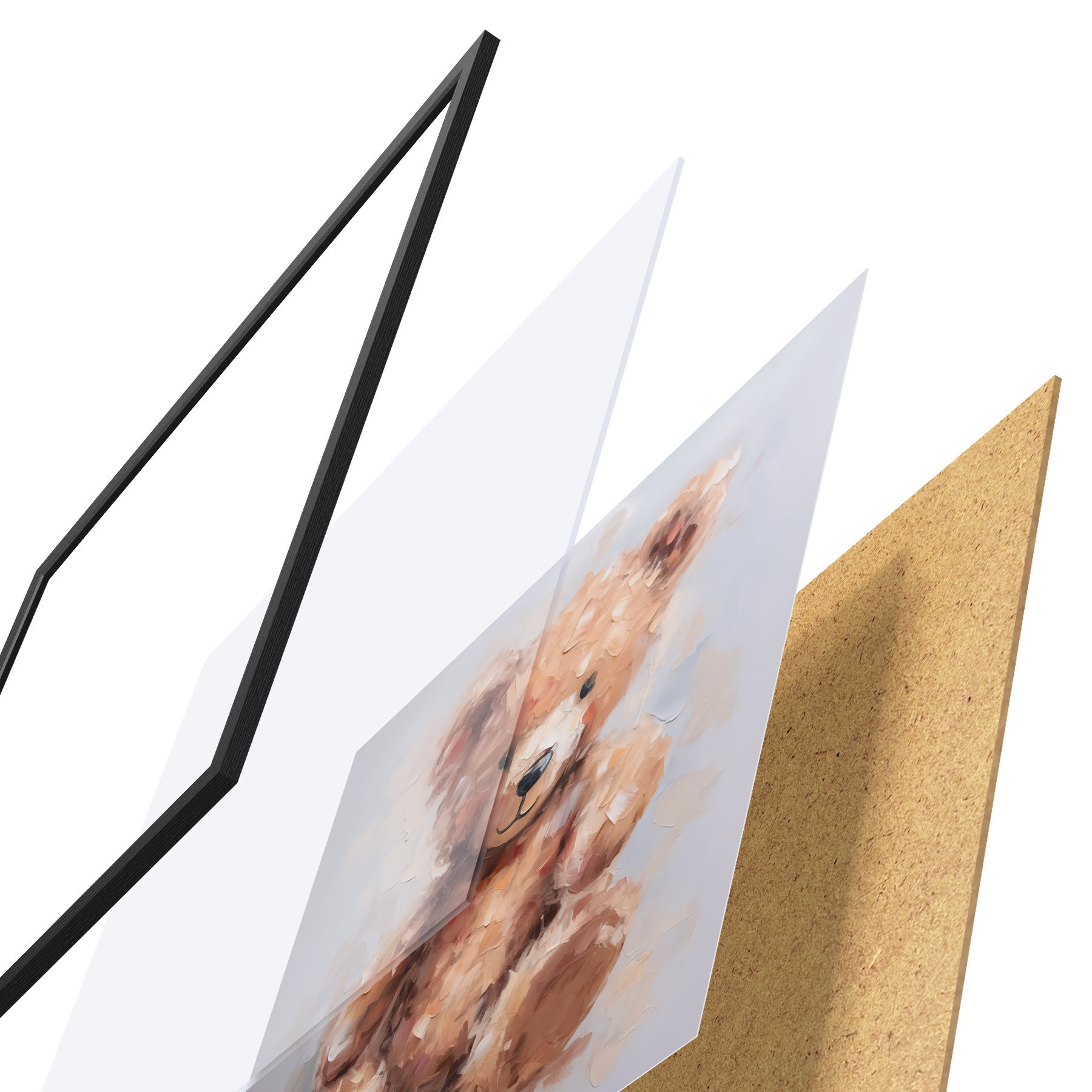 Plagát sa skladá z rámu, plexiskla, vytlačeného obrazu a podkladu z drevotriesky. Plagát možno okamžite zavesiť na stenu vďaka úchytom na zadnej strane.