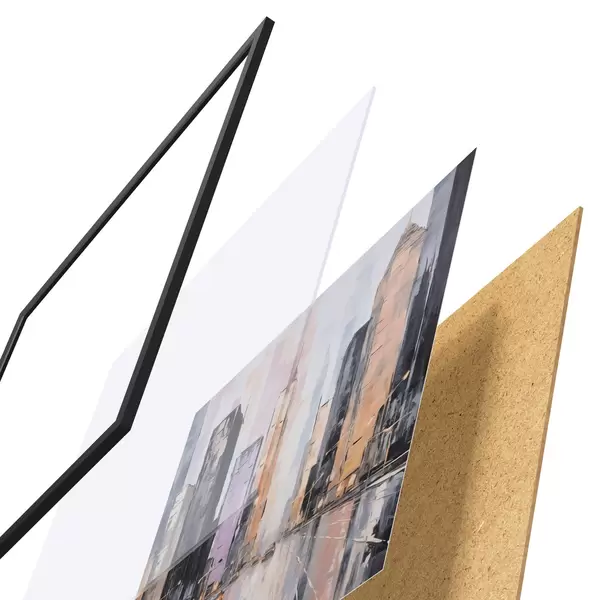 Plagát sa skladá z rámu, plexiskla, vytlačeného obrazu a podkladu z drevotriesky. Plagát možno okamžite zavesiť na stenu vďaka úchytom na zadnej strane.