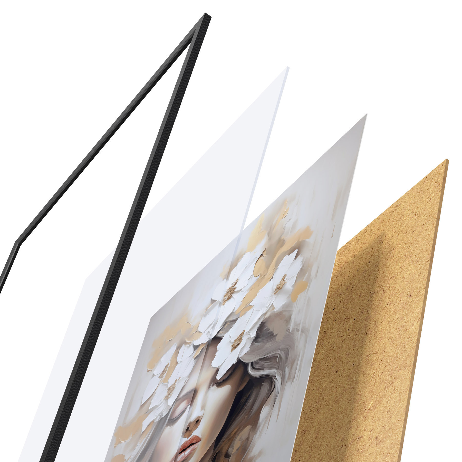 Plagát sa skladá z rámu, plexiskla, vytlačeného obrazu a podkladu z drevotriesky. Plagát možno okamžite zavesiť na stenu vďaka úchytom na zadnej strane.