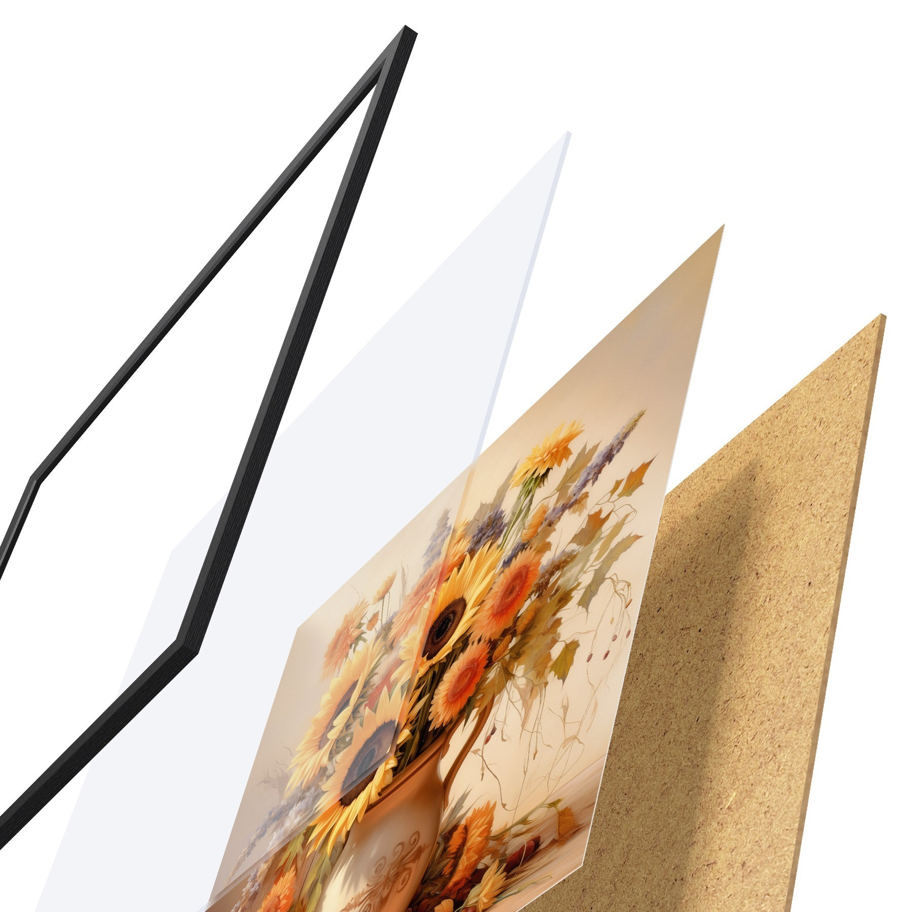 Plagát sa skladá z rámu, plexiskla, vytlačeného obrazu a podkladu z drevotriesky. Plagát možno okamžite zavesiť na stenu vďaka úchytom na zadnej strane.