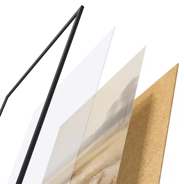 Plagát sa skladá z rámu, plexiskla, vytlačeného obrazu a podkladu z drevotriesky. Plagát možno okamžite zavesiť na stenu vďaka úchytom na zadnej strane.