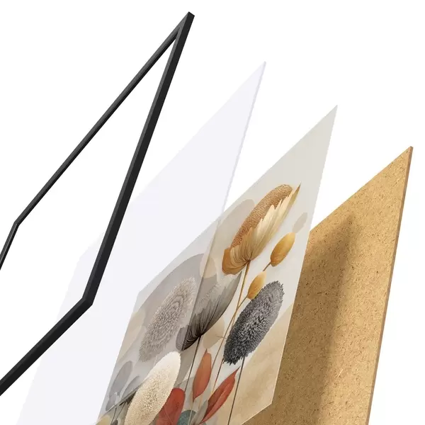 Plagát sa skladá z rámu, plexiskla, vytlačeného obrazu a podkladu z drevotriesky. Plagát možno okamžite zavesiť na stenu vďaka úchytom na zadnej strane.