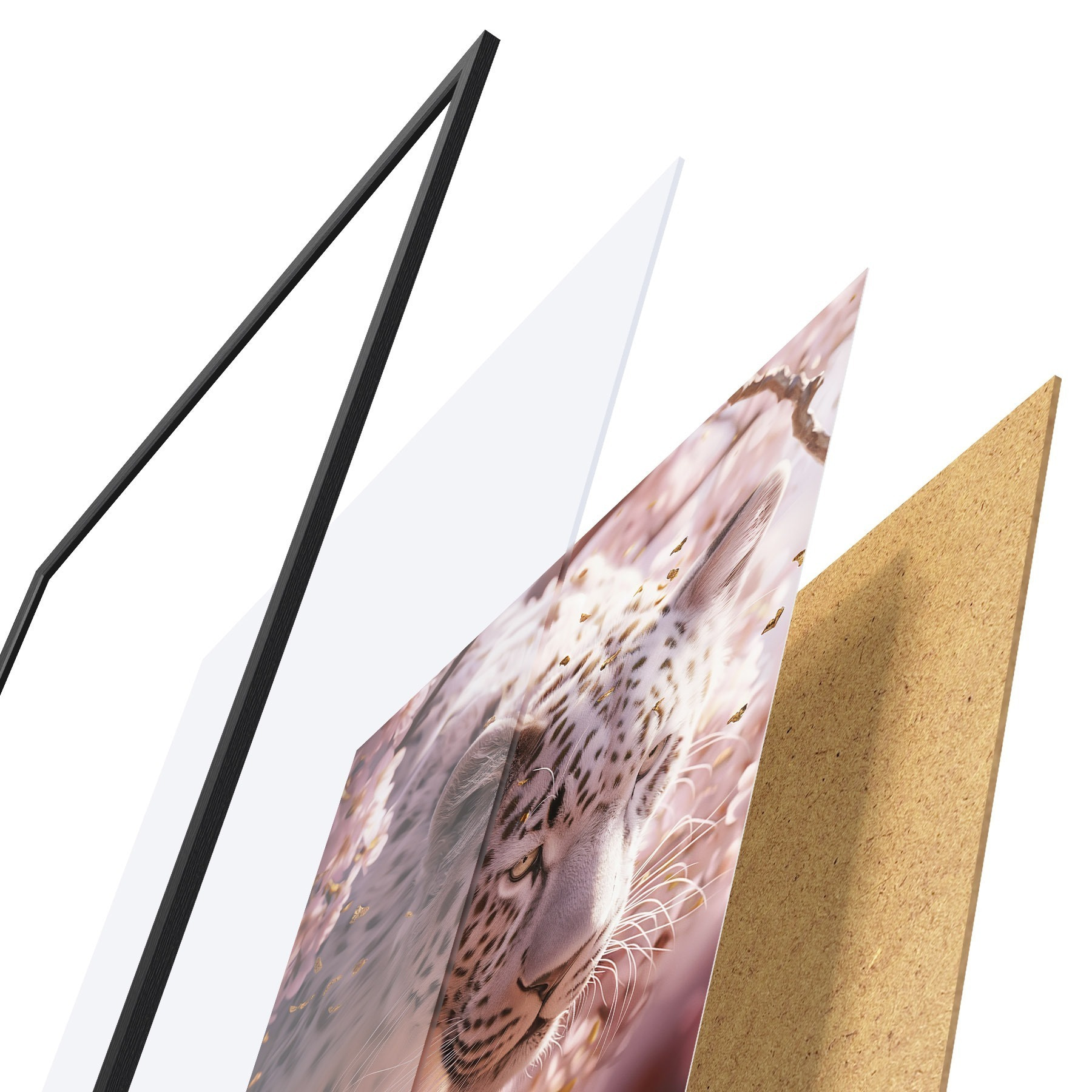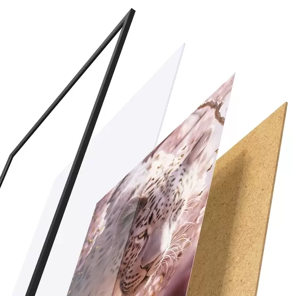 Plagát sa skladá z rámu, plexiskla, vytlačeného obrazu a podkladu z drevotriesky. Plagát možno okamžite zavesiť na stenu vďaka úchytom na zadnej strane.