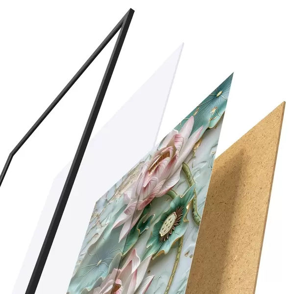 Plagát sa skladá z rámu, plexiskla, vytlačeného obrazu a podkladu z drevotriesky. Plagát možno okamžite zavesiť na stenu vďaka úchytom na zadnej strane.