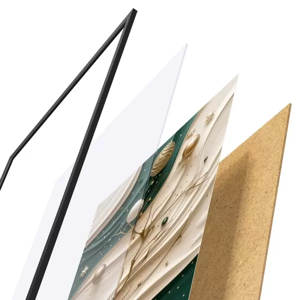 Plagát sa skladá z rámu, plexiskla, vytlačeného obrazu a podkladu z drevotriesky. Plagát možno okamžite zavesiť na stenu vďaka úchytom na zadnej strane.