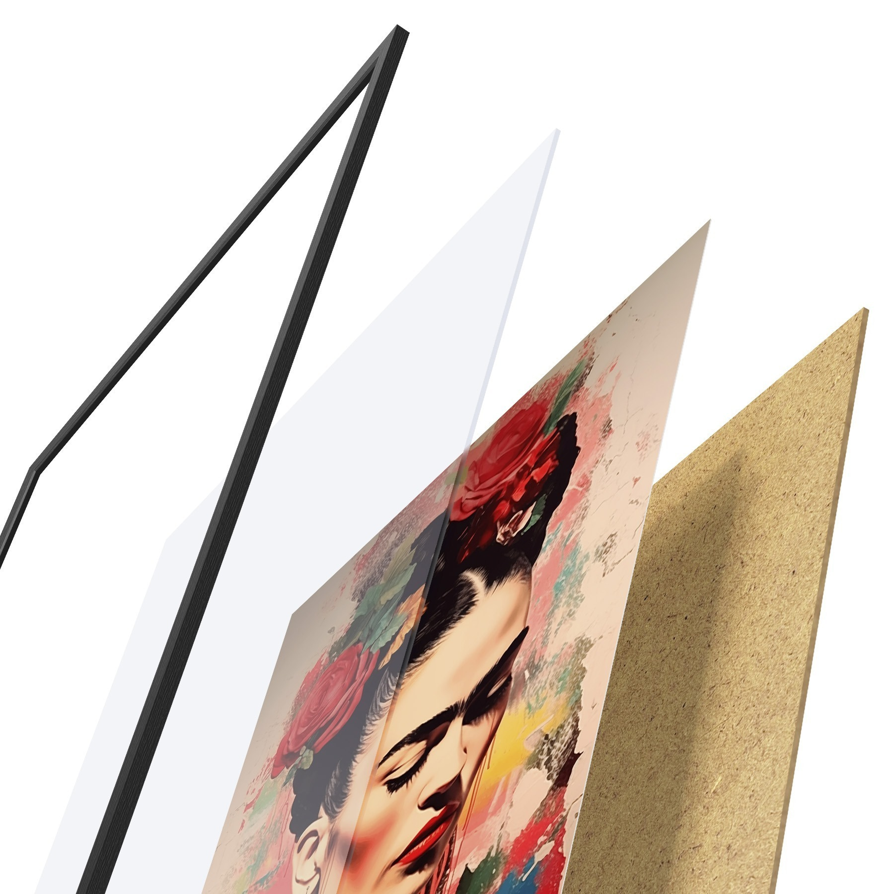 Plagát sa skladá z rámu, plexiskla, vytlačeného obrazu a podkladu z drevotriesky. Plagát možno okamžite zavesiť na stenu vďaka úchytom na zadnej strane.