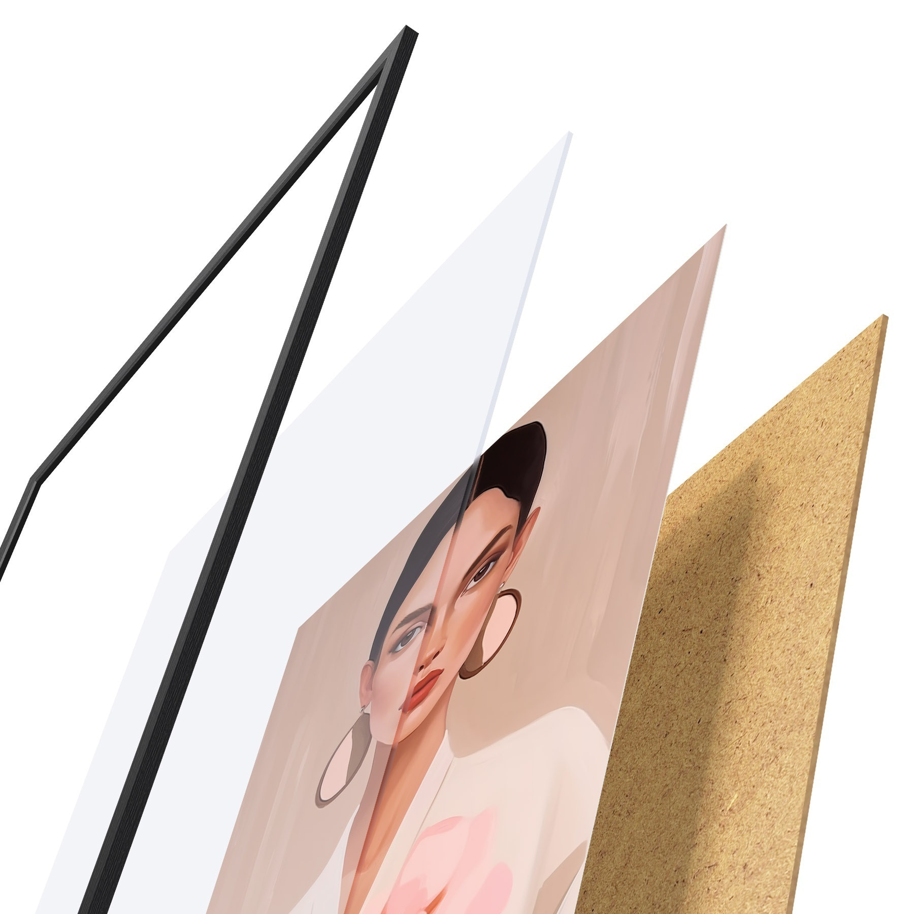 Plagát sa skladá z rámu, plexiskla, vytlačeného obrazu a podkladu z drevotriesky. Plagát možno okamžite zavesiť na stenu vďaka úchytom na zadnej strane.