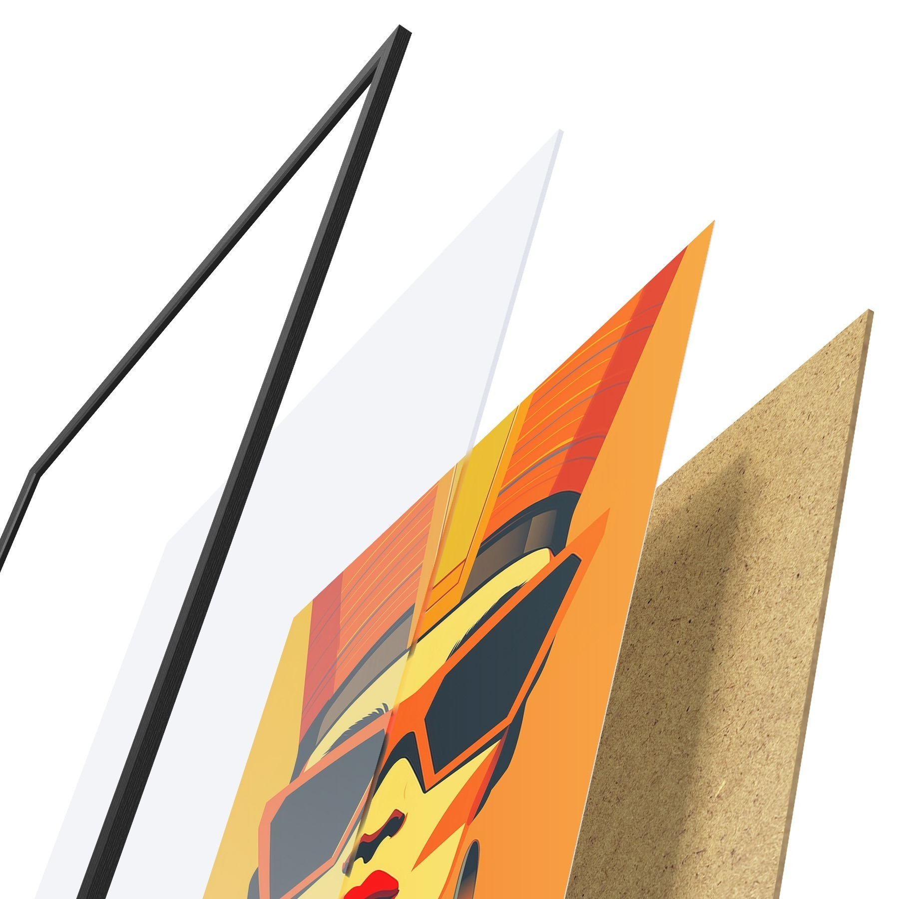 Plagát sa skladá z rámu, plexiskla, vytlačeného obrazu a podkladu z drevotriesky. Plagát možno okamžite zavesiť na stenu vďaka úchytom na zadnej strane.