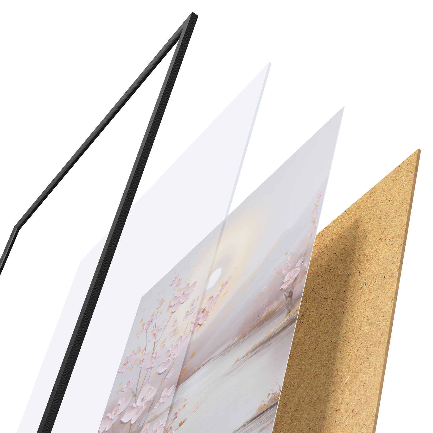 Plagát sa skladá z rámu, plexiskla, vytlačeného obrazu a podkladu z drevotriesky. Plagát možno okamžite zavesiť na stenu vďaka úchytom na zadnej strane.